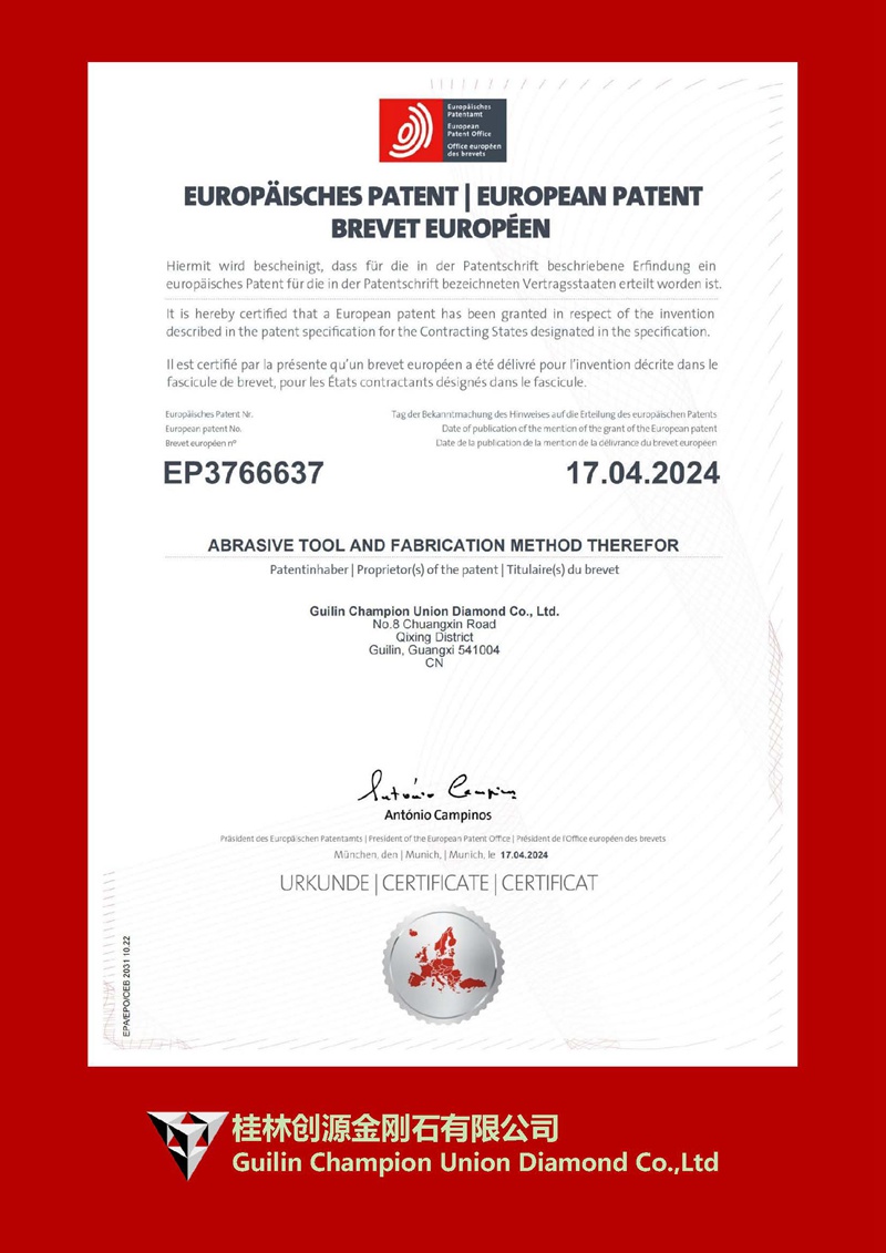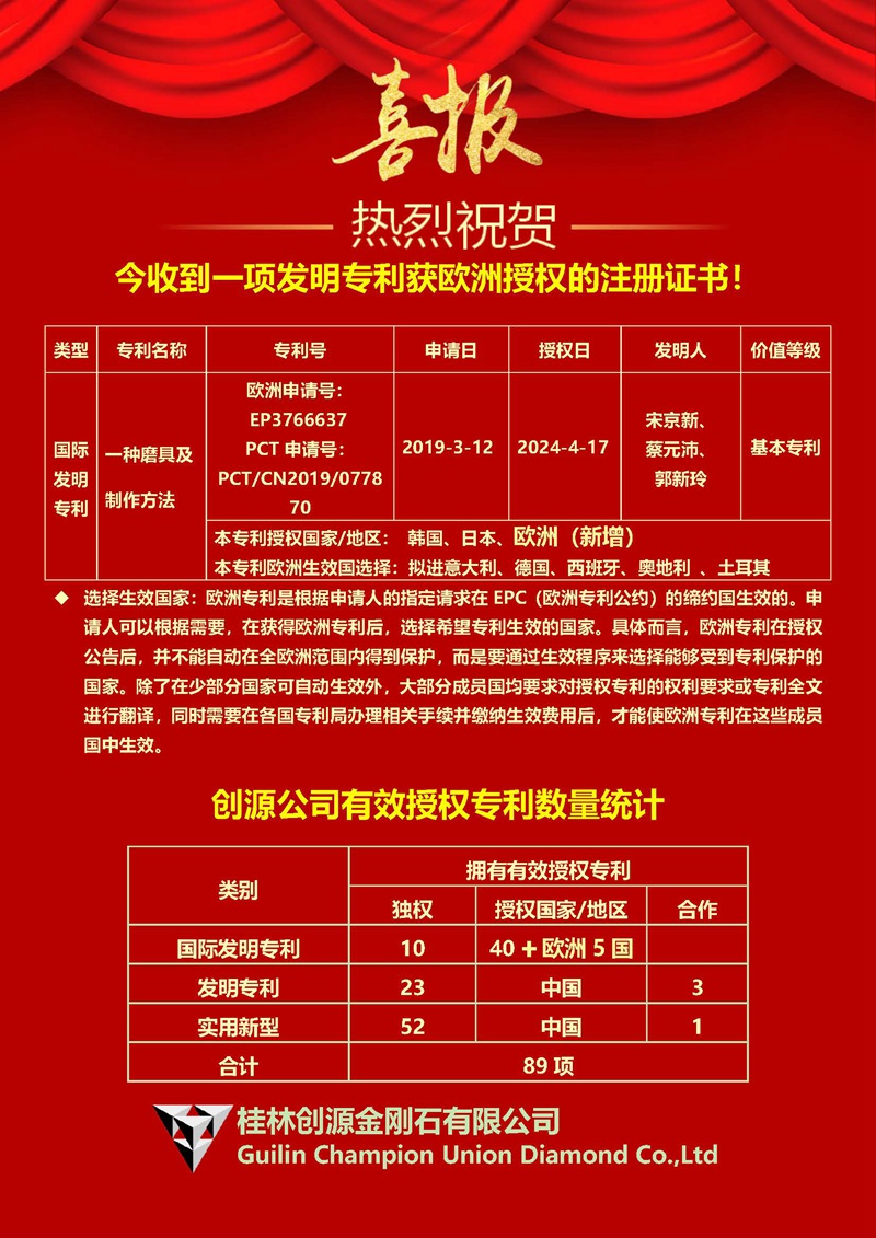2024年5月6日公司一项发明专利取得欧洲授权的注册证书!