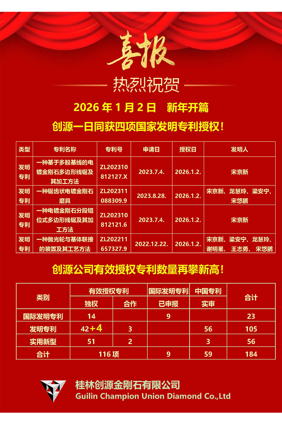 2026年1月2日 新年开篇 创源一日同获四项国家发明专利授权!